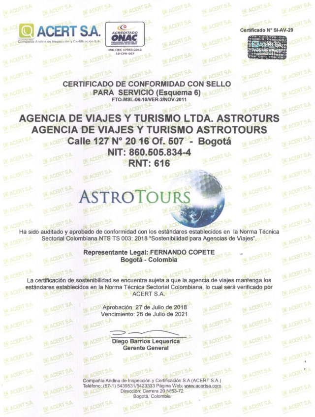 Astro Tours, con registro nacional de turismo 616, se acoge en su integridad a la cláusula de la responsabilidad contenida en la Ley 300 de 1996 Ley General de Turismo y a sus disposiciones posteriores, y a los Decretos 1075 de 1994 y 053 del 18 de enero de 2002. Astro Tours está comprometida con el cumplimiento del Articulo 17 de la Ley 679 de 2001 sobre la prevención de la prostitución, la pornografía y el abuso sexual de menores de edad. La presente cláusula aplica para todos los servicios ofrecidos por la agencia.